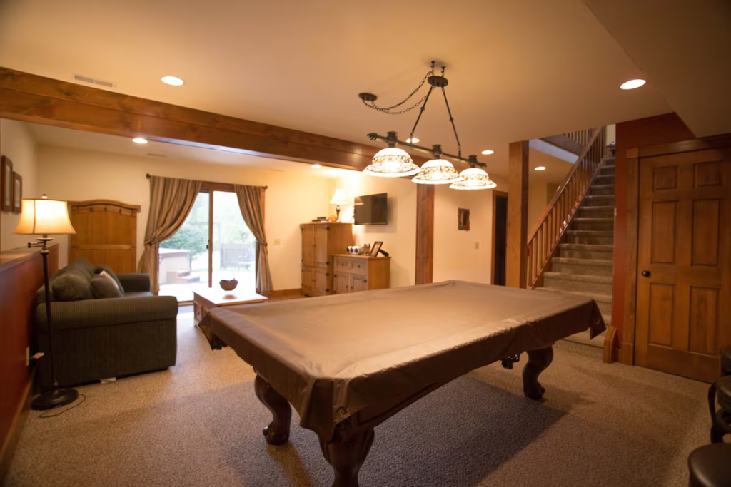 This AirBnB is actually two houses (one 4bdrm and one 5bdrm). Both houses have their own hot tub. The second house has a foosball table instead of pool table.